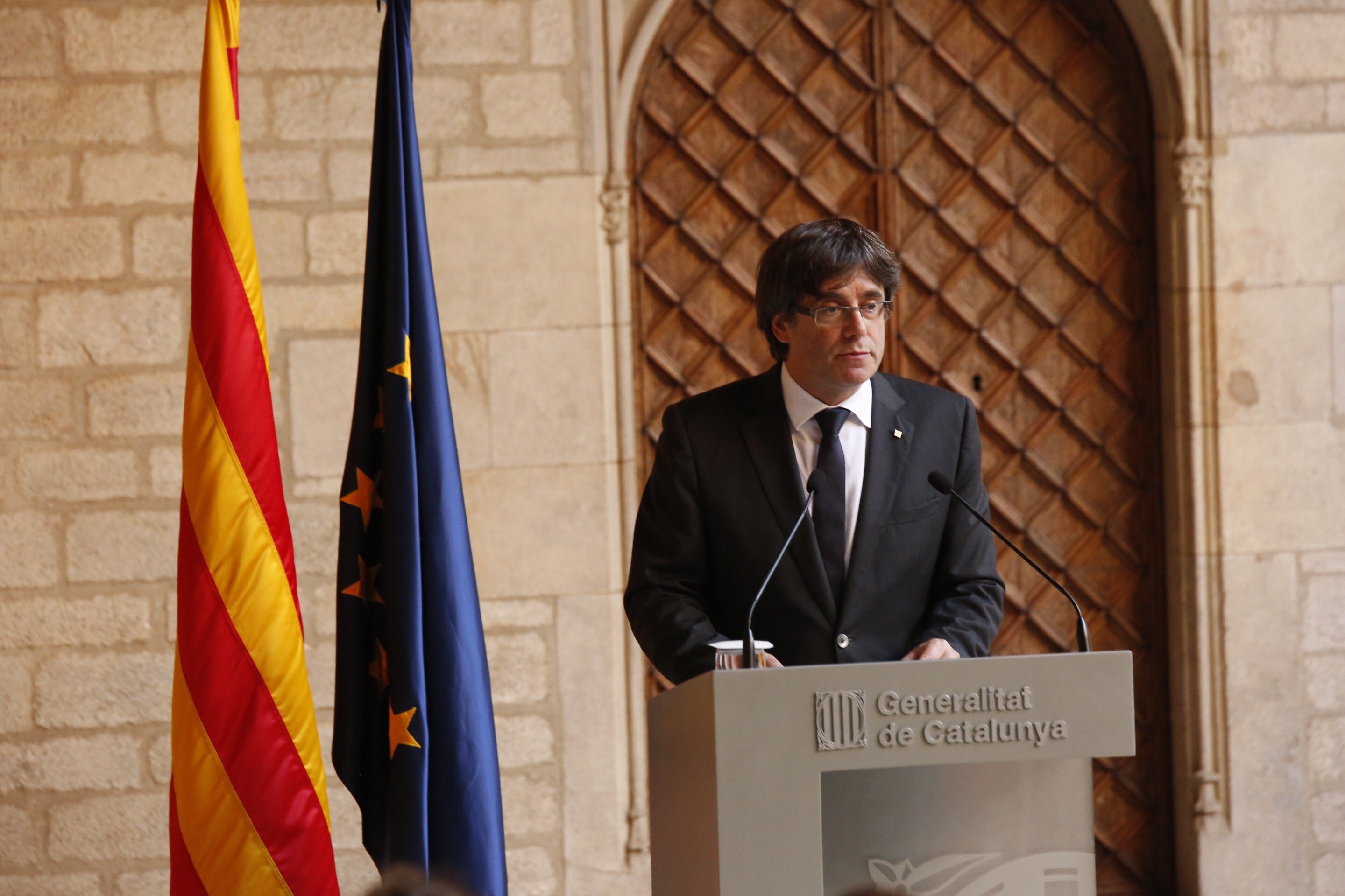 Puigdemont lo ha anunciado desde la galería gótica del palau de la Generalitat en una comparecencia que ha empezado asegurando que como president tenía la responsabilidad de agotar todas las vías para encontrar una solución dialogada y pactada en un conflicto que es político y de naturaleza democrática.