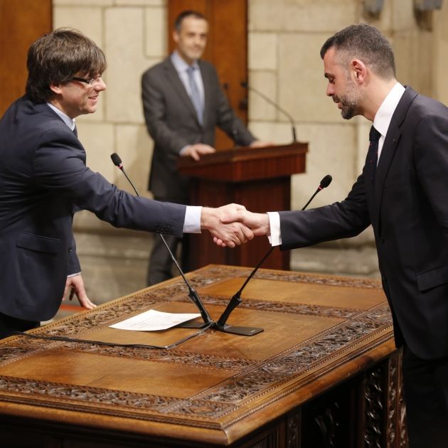 Los consellers han desfilado bajo la atenta mirada de los miembros del Gobierno saliente. Como telón de fondo, el cortinón negro que oculta el retrato del Rey Juan Carlos con un Felipe aún adolescente.El presidente ha tomado juramento a medida que el nuevo secretario del Gobierno, Joan Vidal de Ciurana, llamaba por su nombre a los consellers. A su derecha, el expresidente Artur Mas y la presidenta del Parlament Carme Forcadell eran los primeros en felicitar a los nuevos miembros del gabinete.