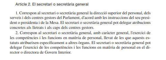 Si nos fijamos con lo que dicta el Parlament de Catalunya, la respuesta es clara: es un órgano técnico: "El secretario general es la cabeza del personal y de los servicios del Parlament y cumple funciones de asesoramiento de la Mesa y la Junta de Portavoces". Este asesoramiento no pasa por una competencia ejecutiva. Este es el artículo que lo especifica:
