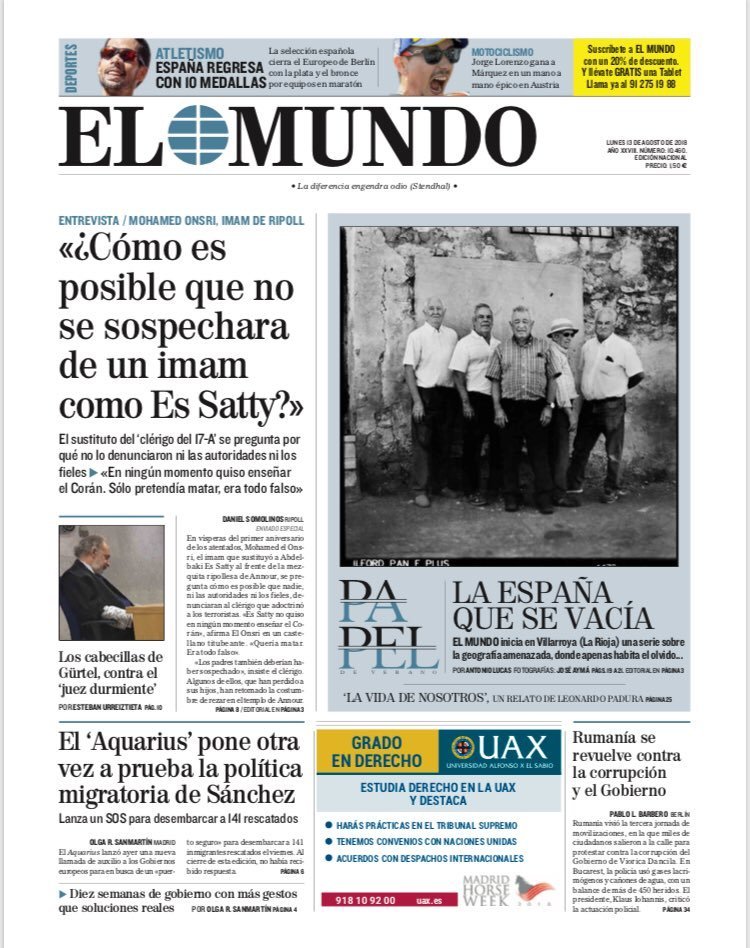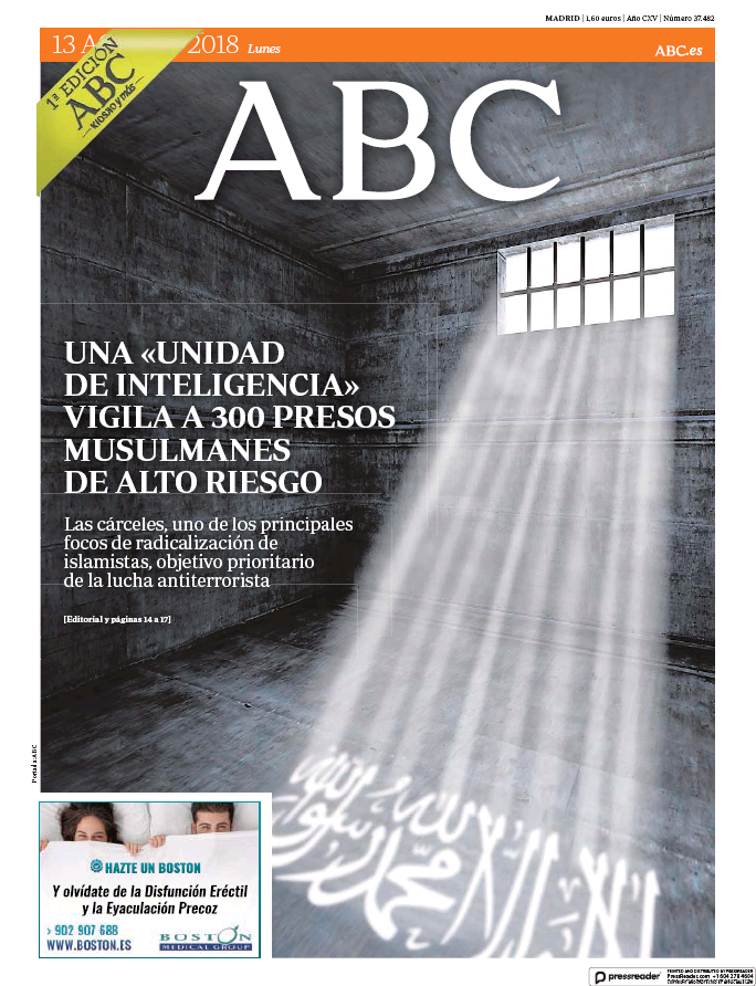 Otros diarios también se centran en aspectos relacionados con el primer aniversario de los atentados, como el ABC que lleva en su edición de hoy una información que apunta que "Una 'unidad de inteligencia' vigila 300 presos musulmanes de alto riesgo", añadiendo que las prisiones se han convertido en el "principal foco de radicalización de islamistas". A su vez, El Mundo ofrece una entrevista con el actual imán de Ripoll, que se plantea como es posible que no se sospechara de su predecesor, Abdelbaki Es Satty, considerado el inductor intelectual de los atentados del 17-A.