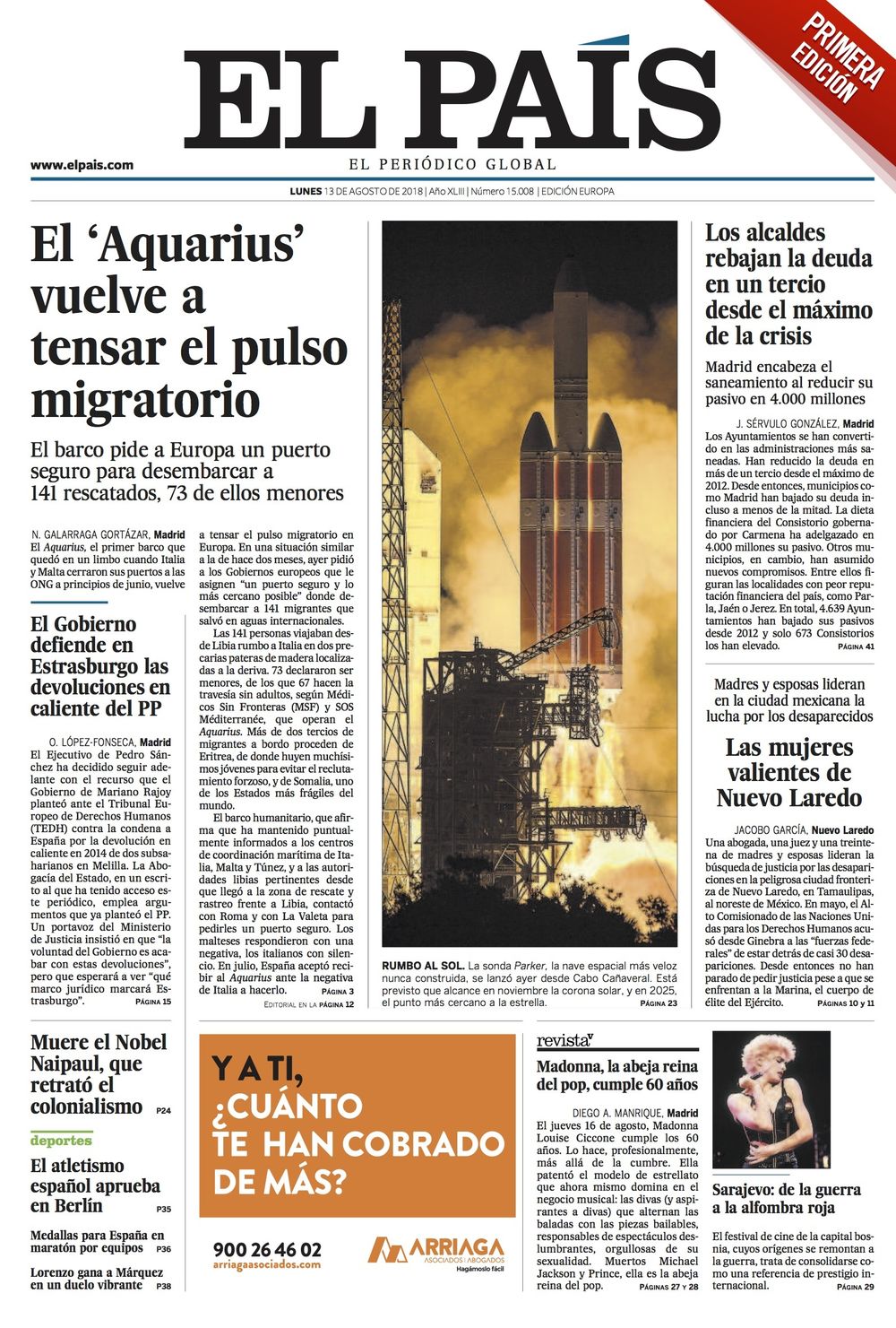 Finalmente, 'El País' no destaca ningún tema relacionado con el 17-A en portada y apuesta por otro de los temas recurrentes de este verano, la crisis inmigratoria, con el titular "El Aquarius vuelve a tensar el pulso migratorio".