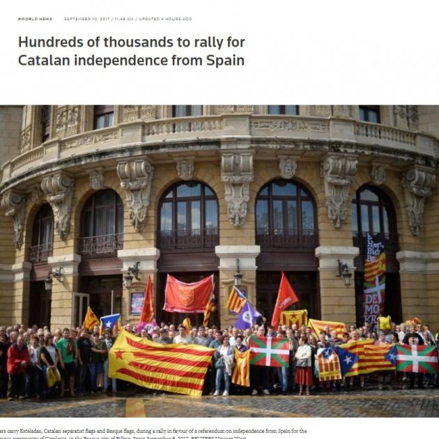 "Centenares de miles de catalanes ocuparán las calles de Barcelona este lunes". Esta es la previsión de la agencia de noticias Reuters para la Diada de este lunes. En una noticia afirma que los organizadores prevén que sea una muestra de apoyo a la independencia "después de que Madrid haya cerrado la puerta a un referéndum pactado".