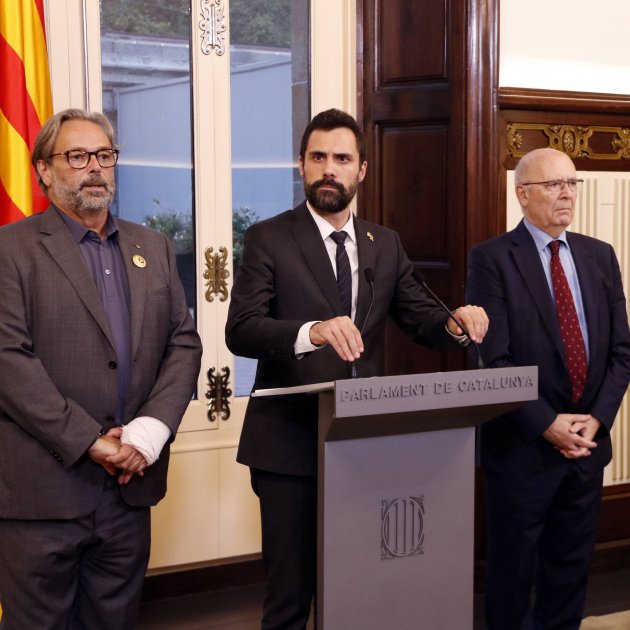 La tormenta que se avistaba desde el ventanal central del despacho de audiencias del Parlament ha sido la escenografía idónea para la declaración institucional que ha protagonizado el president Roger Torrent, acompañado de sus predecesores Núria de Gispert, Ernest Benach y Joan Rigol. "Es uno de los momentos más oscuros desde la restauración de este Parlament con el fin del franquismo". Así ha empezado el discurso.