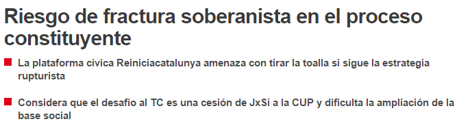 También tituló de manera parecida el pasado 23 de agosto, cuando la plataforma ReiniciaCatalunya.cat tildó de "polémicas" las conclusiones del proceso constituyente que aprobó el Parlamento, en contra de los diferentes avisos del Estado. En aquel momento, el medio mencionado volvió a reiterarse en que eso era un "riesgo de fractura soberanista".
