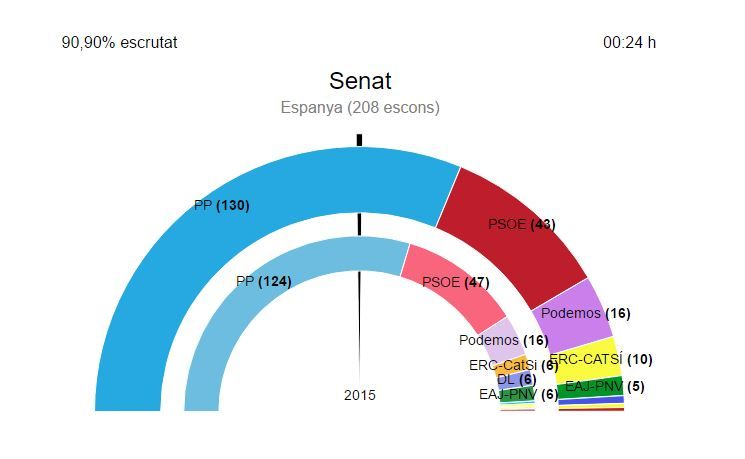 En el resto del Estado, el Partido Popular (PP) ha vuelto a conseguir mayoría absoluta, mejorando incluso los resultados del 20-D. Los populares han conseguido hasta 130 senadores, frente a los 124 que sacó el pasado diciembre. El PSOE ha perdido hasta 4 senadores, quedándose con 43 senadores, mientras que Podemos ha mantenido los suyos con 16 representantes.