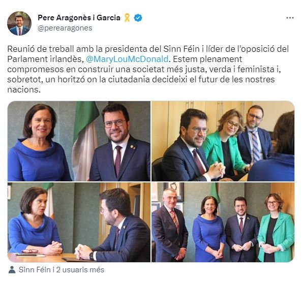 Aragonès, por su parte, ha expresado el agradecimiento al Sinn Féin por "la solidaridad que ha mostrado siempre" con Catalunya, y ha asegurado que trabajará "mucho más" para hacer un "acuerdo de claridad" que fije las condiciones de un referéndum "reconocido". "Esta labor no va de una sola persona ni una sola formación política, sino de un país completo, es importante ofrecer grandes acuerdos" Preguntado por la situación del presidente en el exilio, Carles Puigdemont, Aragonès expresó su "apoyo " por la situación judicial que afronta.