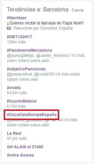 Bajo el hashtag #CocaColaRompeEspaña, centenares de usuarios han empezado a promover un boicot contra Coca-Cola por posicionarse, según su opinión, a favor del proceso catalán y se ha convertido en 'trending topic'.