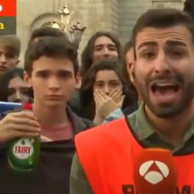Mientras el periodista de esta televisión estaba haciendo una emisión en directo, un grupo de estudiantes se han colocado detrás con esteladas y pancartas. Lo más curioso de este momento ha estado cuando uno de los jóvenes ha enseñado lentamente una botella de Fairy. La cara de chico, entre enigmática e irónica, lo decía todo. El vídeo de este momento ya se ha vuelto viral.