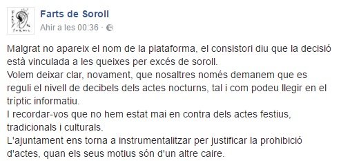 No obstante, esta misma plataforma ha denunciado en su página de Facebook que ellos "sólo han pedido que se regule el nivel de decibelios de los actos nocturnos" y que "nunca han estado en contra de los actos festivos, tradicionales y culturales".