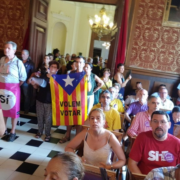 En el exterior del consistorio había gente, pero en el interior de la sala de plenos también había manifestantes. Estos han querido mostrar su rechazo hacia la moción presentada por el alcalde socialista, Josep Félix Ballesteros, en contra de cualquier tipo de colaboración con el 1-O.