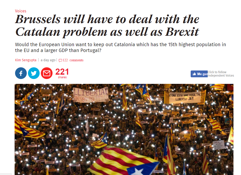 "Las elecciones convocadas por el Gobierno español, después de la intervención de la administración autonómica, se han convertido en unas elecciones cruciales no sólo para Catalunya y España, sino también para la Unión Europea. La aceleración y la gravedad de lo que está pasando ha sorprendido a diplomáticos y políticos occidentales, según reconocen. Existe la conciencia de que Bruselas deberá hacer frente al problema catalán y a un proceso del Brexit cada vez más agresivo y caótico", apunta.