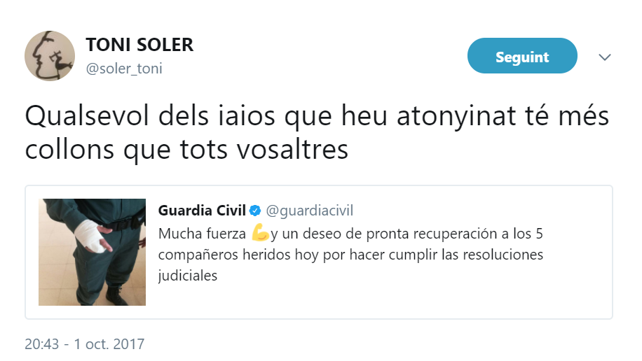 Soler ha utilizado el polémico tuit de la cuenta de la Guardia Civil, donde se adjuntaba una foto de un agente con una mano vendada. "Cualquiera de los yayos que habéis zurrado tiene más cojones que todos vosotros", reivindicaba.