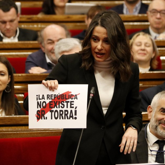 La exhibición de carteles con que la presidenta de Ciudadanos, Inés Arrimadas, acostumbra a ilustrar sus intervenciones en el Parlament ha provocado esta mañana en el hemiciclo la burla del president, Quim Torra, que ha ridiculizado el gesto de la líder naranja. "Veo que queda inaugurada la nueva temporada de cartelitos de Ciudadanos 2019. Nos vamos renovando", ha arrancado el president cuando Arrimadas le ha plantado enfrente un cartel donde se podía leer "¡La República no existe, Sr. Torra!" utilizando la misma grafía y estética de los carteles que reclaman la libertad de los presos.