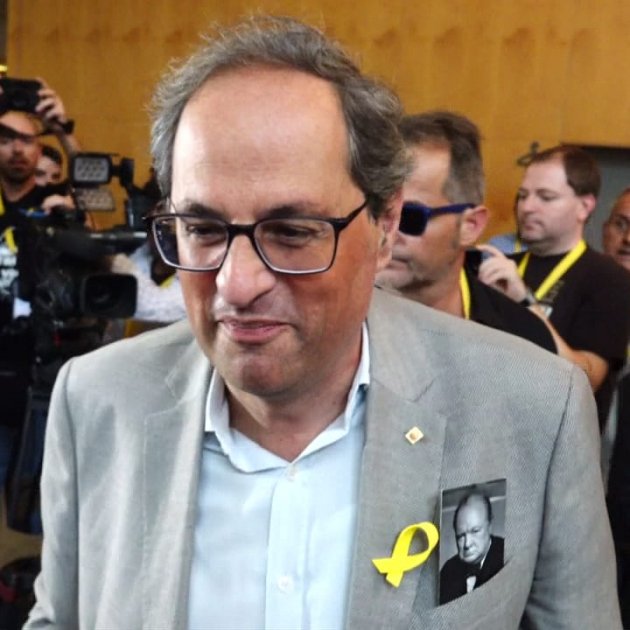 El president, que se ha presentado con una imagen de Winston Churchill en el bolsillo, ha subrayado el "valor inmenso" que representa "el enorme liderazgo" de Puigdemont para el independentismo, al igual que el del vicepresident Oriol Junqueras y el resto de presos y exiliados.