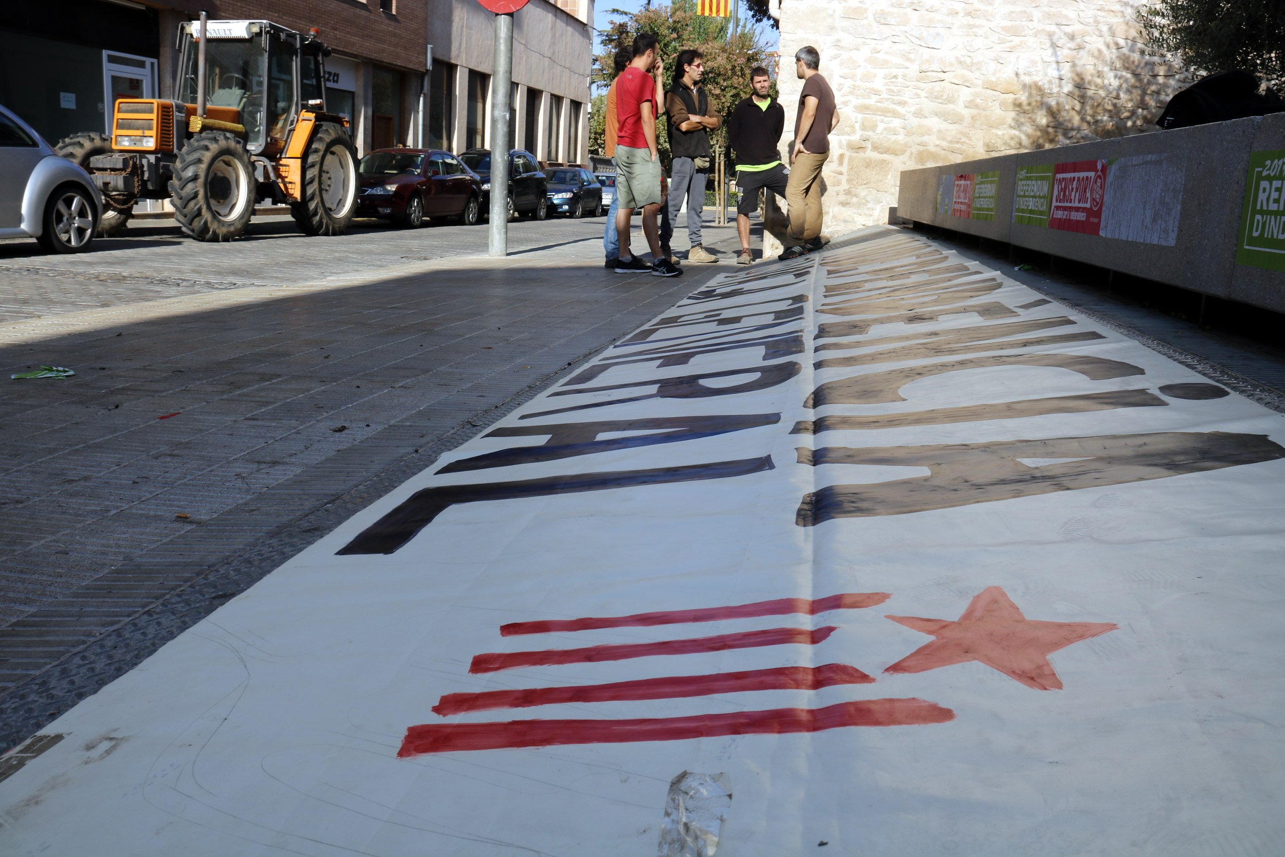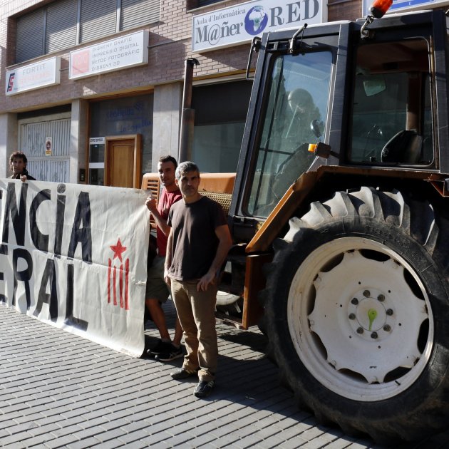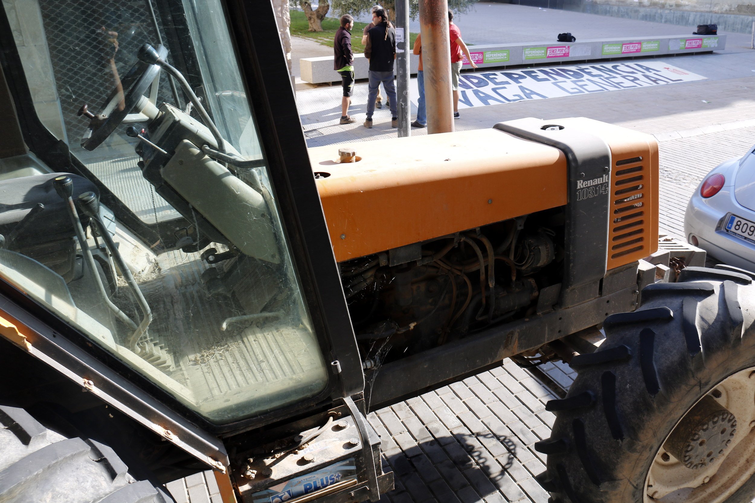 El tractor aparcado al lado del Pavelló de l'Oli de les Borges Blanques es de la familia de Josep Farran, que también es concejal de la CUP en el Ayuntamiento de la capital de las Garrigues y se dedica parcialmente al campo. Lo aparcó ayer miércoles por la noche y no prevé tocarlo de esta zona hasta que se acaben las votaciones el domingo. Este jueves por la mañana, Farran, acompañado de varios miembros de la Assemblea Pagesa, ha desplegado una pancarta donde se podía leer ''Independencia. Huelga general'' en el acceso del pabellón y al lado del tractor.