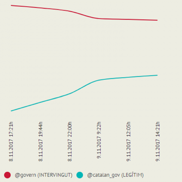 Según recoge el mismo Calvís, ayer en las 17:21 h @govern tenía 277.316 seguidores y @catalan_gov 76.796. Pasadas las 12 h de este mediodía, las mismas cuentas han registrado a 250.985 y 140.275 seguidores, con una diferencia de sólo 110.000 usuarios aproximadamente. Pasadas las dos del mediodía, las cifras han mantenido esta tendencia.