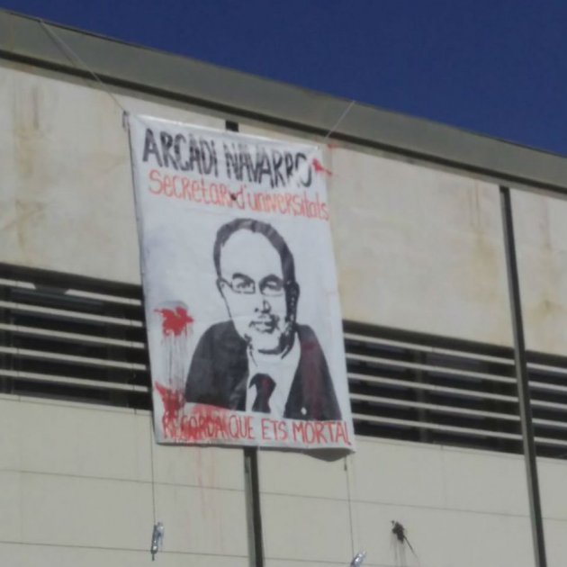 Un grupo de estudiantes se manifestó este martes en el campus de la UAB para exigir la rebaja de las tasas universitarias. Durante la marcha se colgó de uno de los edificios de la universidad una pancarta con una caricatura del secretari d'Universitats, Arcadi Navarro, y un texto manchado de rojo en el que se podía leer "Recuerda que eres mortal".
