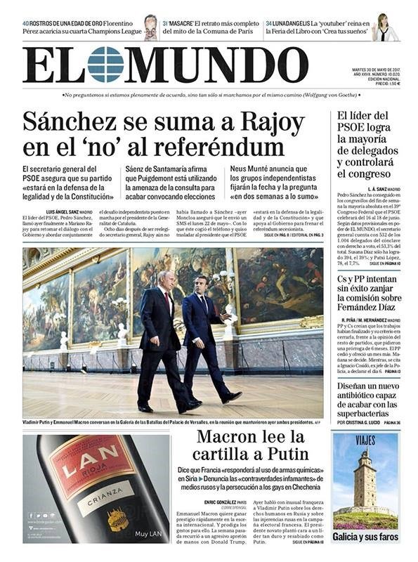 El Mundo, que reúne en su portada la llamada del líder del PSOE al presidente español, las declaraciones de Soraya Sáenz de Santamaría y el aviso de Neus Munté de fijar fecha y pregunta en menos de dos semanas, centra su editorial precisamente en la avenencia, en este sentido, de Sánchez y Rajoy.