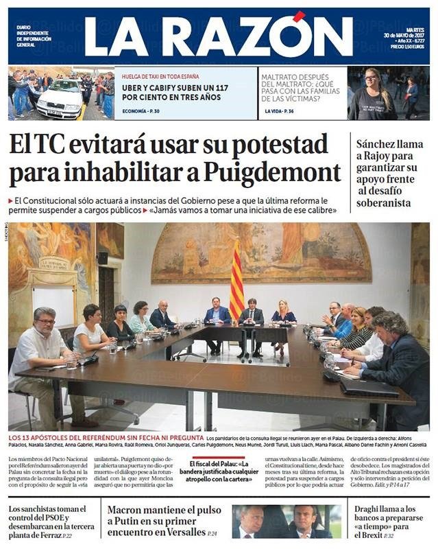 La Razón también dedica su editorial al acuerdo implícito en una llamada entre el PP y el PSOE. Destacan como este hecho servirá para acabar con "la escena de su elaborado victimismo" y emplazan a la justicia —Fiscalía, Tribunal Constitucional, etc.— a actuar "en defensa de la legalidad" suspendiendo, por ejemplo, los cargos que desobedezcan.