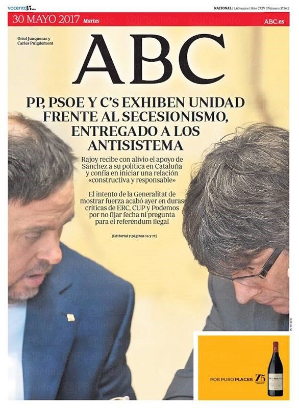 El ABC, de su lado, abre con una fotografía en página entera de Puigdemont y Junqueras y, pegándose a las palabras que pronunció ayer la vicepresidenta española, Soraya Sáenz de Santamaría, que el PP, el PSOE y Cs muestran unidad ante el independentismo "entregado a los antisistema".