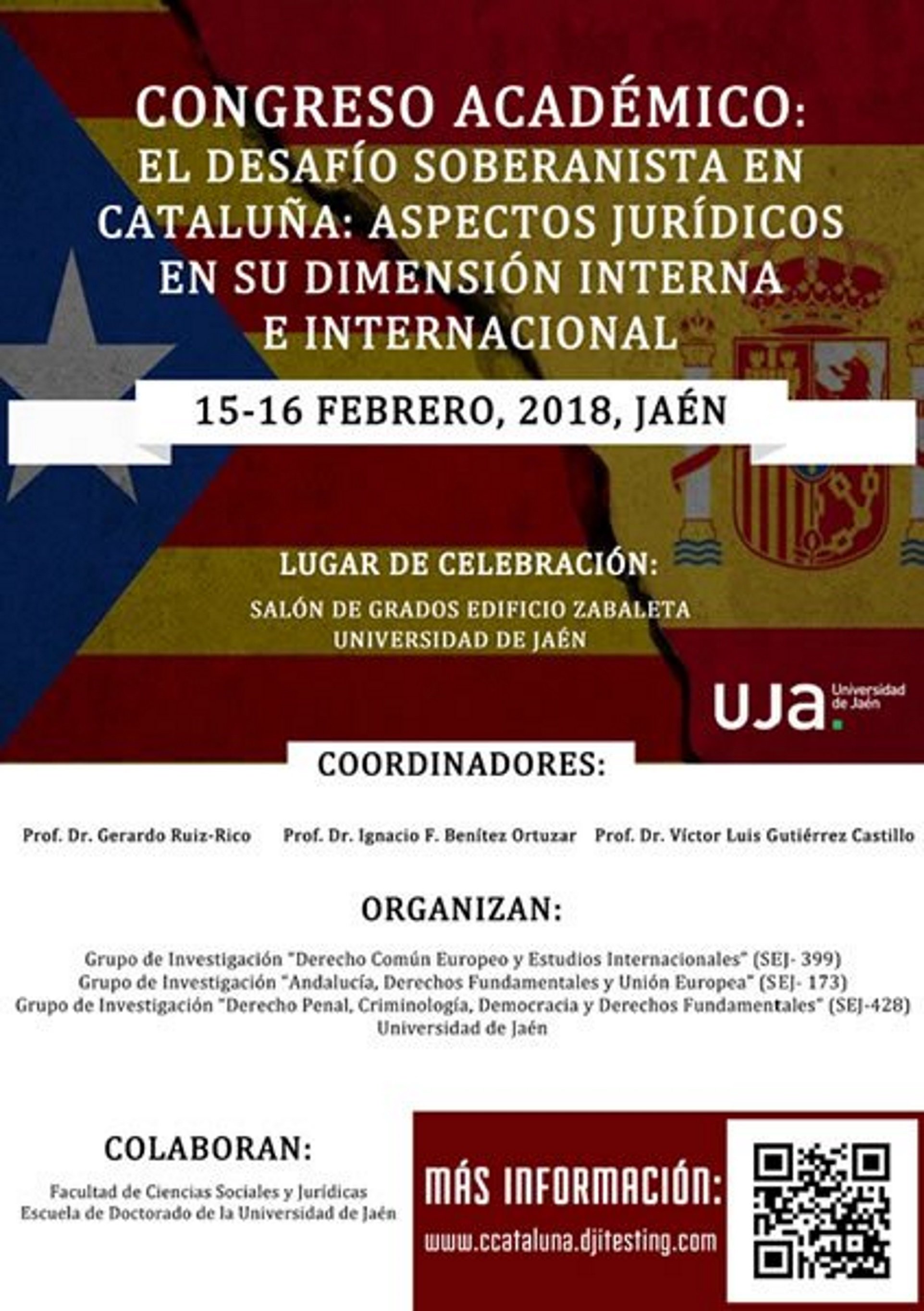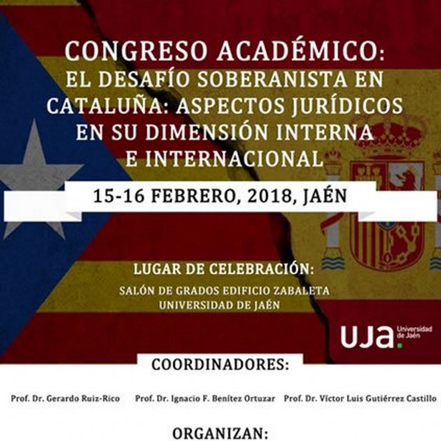 La Universidad de Jaén celebrará el 15 y 16 de febrero un congreso sobre los aspectos jurídicos del proceso independentista. El congreso se titula "El desafío soberanista en Catalunya: aspectos jurídicos en su dimensión interna e internacional" y prevé abordar el impacto español e internacional del procés, así como la repercusión que tiene sobre la Constitución de 1978.