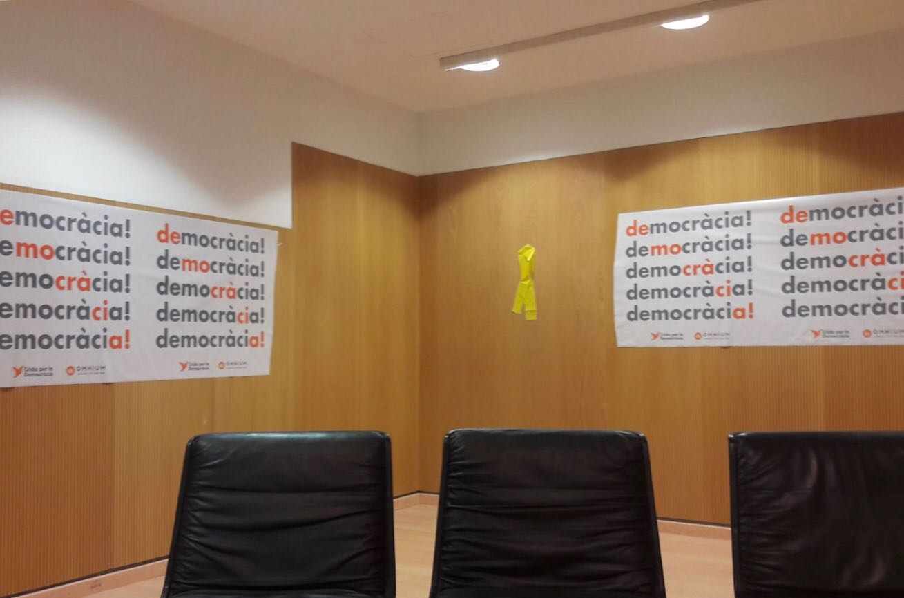La situación ha llegado al punto que, como muestran las imágenes, los organizadores han tenido que retirar el roller con el logotipo de la universidad que habitualmente preside la sala y en el cual se había colgado un lazo amarillo. El lazo ha acabado colgado en la pared.