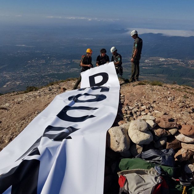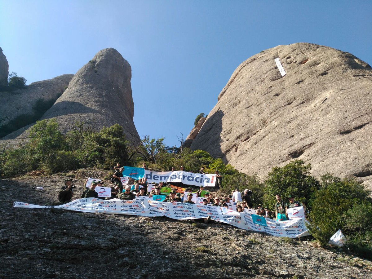 Unos 80 agentes rurales han realizado un acto reivindicativo a favor del referéndum y de la democracia en Montserrat, en el Gorro Frigi, una de las rutas de escalada tradicional en el macizo.