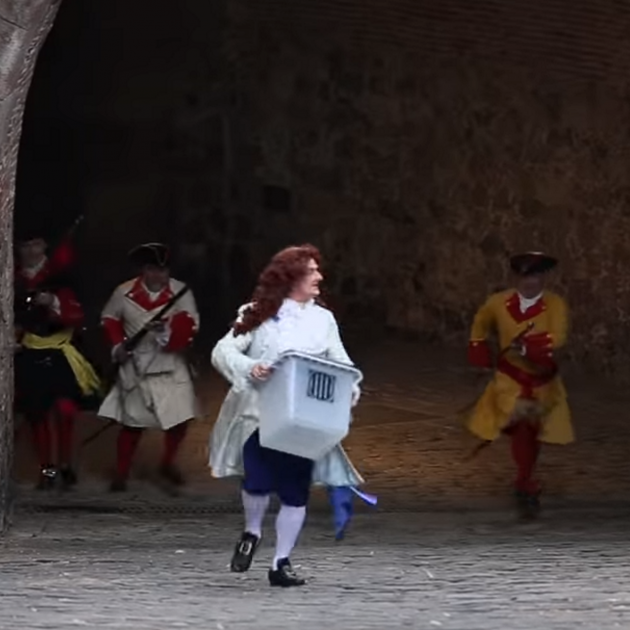 En el vídeo, aparece el personaje de Felipe V intentando impedir el referéndum del 1 de octubre, pero empeñándose en realidad que la gente deje de ir con el lirio en la mano.