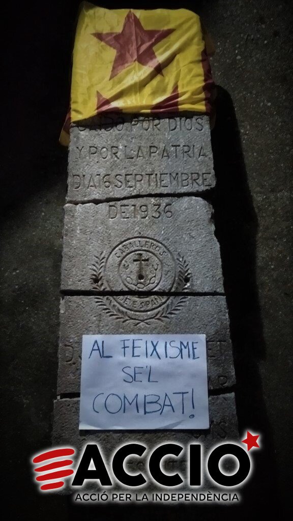 Acció per la Independència, que se constituyó el 23 de abril pasado, ha hecho un llamamiento a "hacer caer toda la simbología franquista que todavía está en pie en el territorio". "Hacemos un llamamiento a replicar y multiplicar las acciones, a hacer visible el conflicto y combatir la ocupación. Es el momento de iniciar un nuevo ciclo, recuperar la iniciativa y organizar la resistencia que haga posible la lucha por la independencia", aseguraron en un comunicado. El grupo no tiene caras visibles. Se reivindica como una organización anónima, transversal y unitaria.