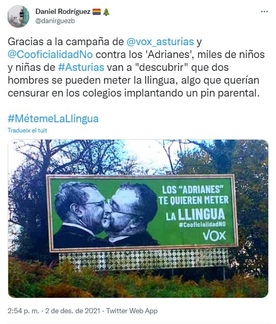 "Los 'adrianes' te quieren meter la lingua" reza el cartel instalado en las afueras de la ciudad de Oviedo, según informa La Voz de Asturias. La ilustración que acompaña esta frase muestra a los dos políticos dándose un beso.