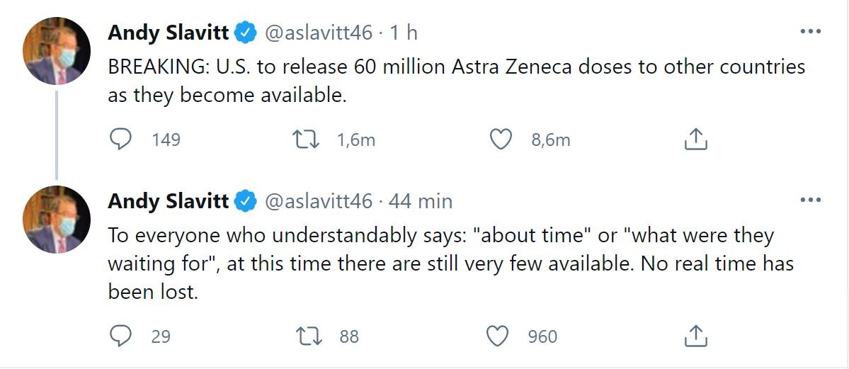 Según la agencia Efe, la portavoz de la Casa Blanca, Jen Psaki, también ha confirmado la decisión del gobierno de Joe Biden de enviar los 60 millones de dosis de AstraZeneca a otros países, ya que esta vacuna todavía no ha sido aprobada por la Administración de Medicamento y Alimentos de los EE.UU. (FDA, por sus siglas en inglés).