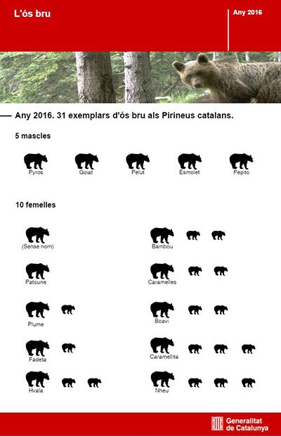 Los sistemas de seguimiento y control de la población de osos pardos en los Pirineos han detectado, durante las últimas semanas, que ya han despertado de la hibernación. Justo antes de este proceso, a finales del año pasado, se habían contabilizado en Catalunya 31 individuos de oso pardo, con 5 machos adultos y 10 hembras adultas, todas ellas con crías. En el 2016 pues, se ha conseguido un hito histórico entre la población de osos en los Pirineos catalanes desde su reintroducción, con el nacimiento de 10 crías.