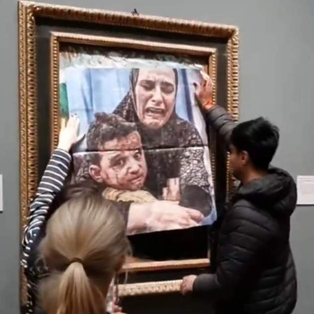 Dos activistas propalestinos han pegado una fotografía de una mujer palestina y su hijo en Gaza sobre el cuadro La Maternidad, de Pablo Picasso en la National Gallery de Londres, para protestar contra la guerra en Gaza y reclamar el embargo de armas en Israel, según ha indicado la organización Youth Demand, a la cual pertenecen. La organización ha explicado que la imagen es obra del periodista Ali Jadallah y muestra a dos personas angustiadas y ensangrentadas, cubiertas de escombros", en concreto, una madre sosteniendo a su hijo herido después de un ataque israelí.