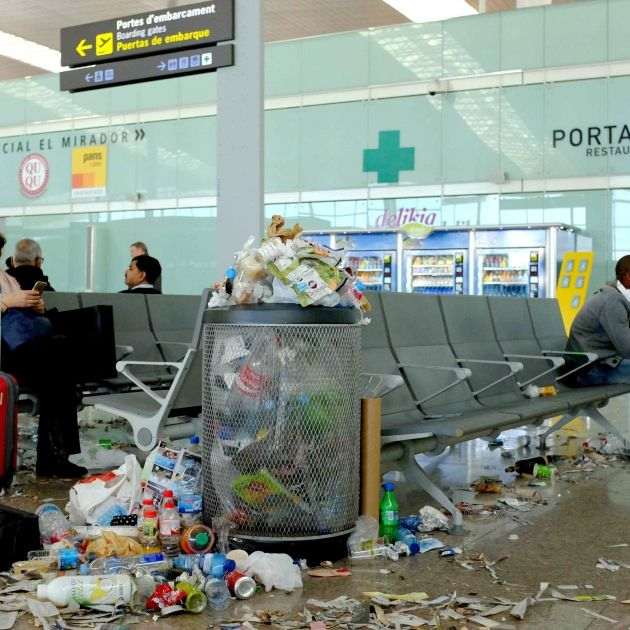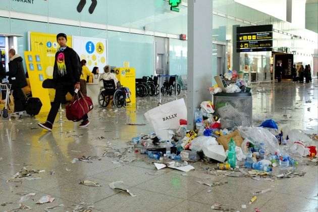 Papeles, botellas, bolsas de plástico... Ningún tipo de residuo falta en el suelo del Aeropuerto del Prat. Ya son cuatro días consecutivos sin servicio de limpieza y las papeleras no admiten más objetos.