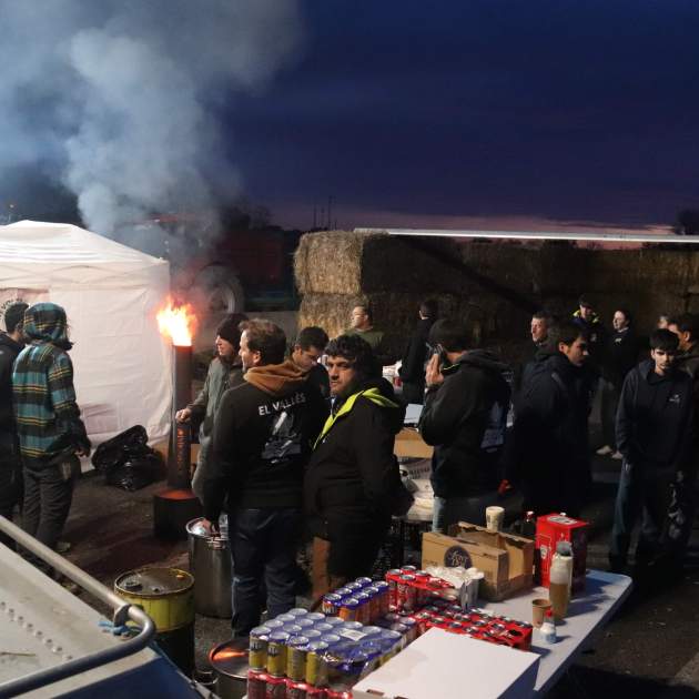 Los que no han dormido en los vehículos lo han hecho en las carpas que han levantado en la misma autopista. El central, con soportes de hierro, acoge la cocina improvisada donde se preparan las comidas para todos los concentrados. Los otros dos espacios, construidos con balas de paja y una vela por techo, están pensados para mantener el calor durante la noche y protegerse de la lluvia que podría llegar en cualquier momento. Aparte de la cena caliente, también se ofrecen yogures de una granja de Campllong, manzanas de Girona y otros productos de proximidad aportados por los ganaderos y agricultores movilizados. Parte del avituallamiento se ha conseguido gracias a las donaciones de vecinos y simpatizantes recogidas las últimas semanas.