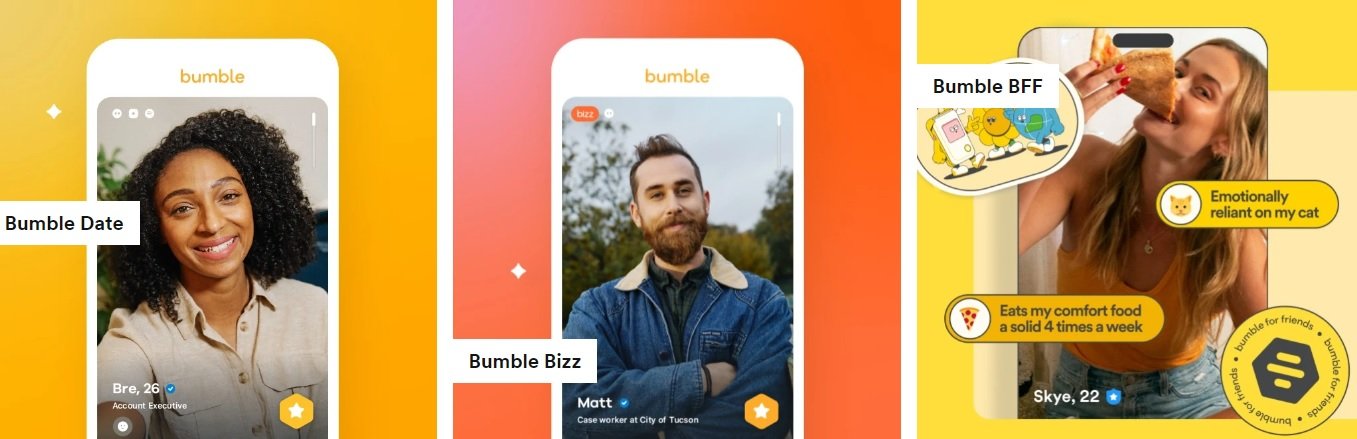 Bumble se presenta ante el mundo como una app de citas que quiere que las mujeres sean las que lleven la iniciativa, y, por lo tanto, las encargadas de decidir si quieren hablar con el resto de usuarios o no. A diferencia de otras aplicaciones, en esta, una vez se ha hecho match, las mujeres son las que tienen que iniciar la conversación, y si pasan más de 24 horas sin hablar en un chat, la misma aplicación es la que se encarga de eliminar el contacto. A diferencia de otras apps de citas, no solo tiene el objetivo de facilidad encontrar pareja, sino que ofrece a los usuarios tres funciones: buscar pareja, con Bumble Honey, hacer nuevos amigos, con Bumble BFF, y la de ampliar la red de contactos profesionales, con Bumble BIZZ.