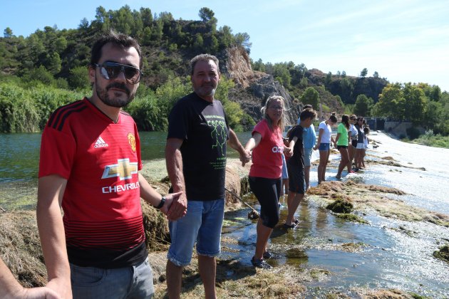 Los vecinos de Tivenys y de Xerta han atravesado el río Ebre desde los respectivos márgenes y se han encontrado justo en medio de la presa del Assut. Aunque no han llenado los 370 metros de agua que separa los dos municipios, sí que han llenado un buen tramo. Los dos grupos, encabezados por los alcaldes, se han cogido las manos y han escenificado así su apoyo con los afectados del fuego de la Ribera d'Ebre que quemó 5.000 hectáreas de cultivos y bosque este junio. En la acción han participado más de una cincuentena de personas y en todo el acto cerca de un centenar.