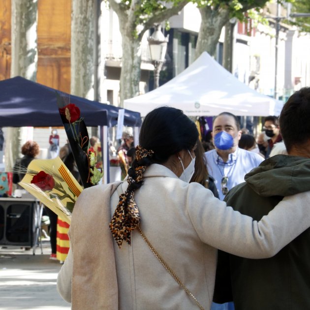 También Sant Jordi con regusto de normalidad en Girona, si no fuera por las mascarillas, el gel hidroalcohòlic, la distancia de seguridad y los controles de acceso obligados por la pandemia. A lo largo de la mañana, buena afluencia tanto a la explanada de la Copa (donde hay los puestos de floristerías y librerías) como a la Dehesa, el espacio reservado a las entidades. Entre un lugar y el otro se reparten una sesentena de paradas|puestos. En algunos momentos, se han empezado a formar colas bajo un solo radián para acceder. Los paradistas y los gerundenses se han entregado a disfrutar de la festividad, sobre todo después de que el confinamiento restañara el Sant Jordi del 2020. Por toda la ciudad, también hay puntos de venta justo ante los comercios.