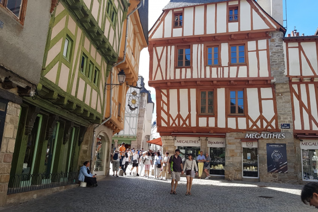 Vannes es una de las otras dos capitales históricas de Bretaña. A diferencia de Rennes, está orientada al mar y esta situación ha dibujado su historia y ha marcado su papel dentro del mundo bretón. Su puerto, situado en el culo de una estrecha ría que no té más de cincuenta metros de anchura, está lleno de embarcaciones deportivas. Pero durante la Edad Media fue una de las escalas obligadas de la navegación comercial atlántica. A pie de puerto, la ciudad histórica se recluye detrás de la muralla; y en su interior estalla una trama de calles, plazas y casas de urbanismo y arquitectura tradicionales. La puerta de Saint-Vicent, la catedral de Saint-Pierre y la iglesia de Saint-Patern y las calles, callejuelas, plazas y placitas de los alrededores nos revelaron que Vannes se la hermana mayor de Dinan.