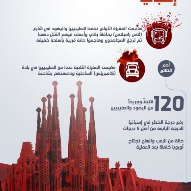 Mediante una infografía con un diseño sangriento, esta publicación de Daesh detalla los daños provocados en la capital catalana y en Cambrils, y cifra en 120 el número total de fallecidos y heridos.