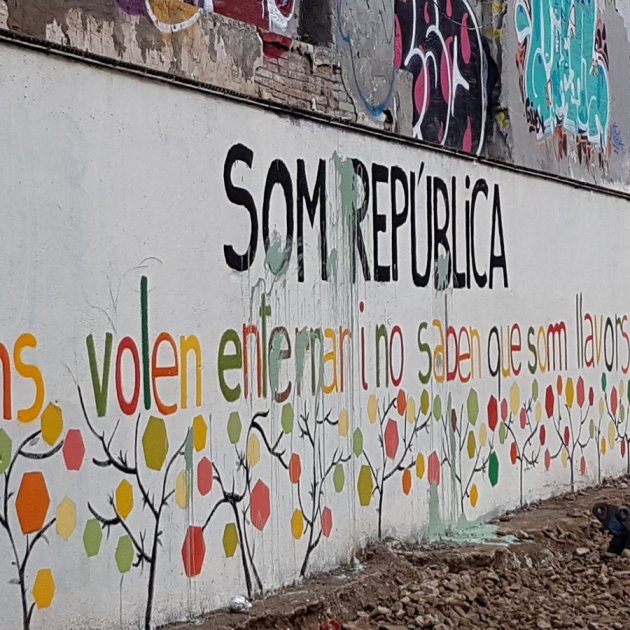 Un grupo de vecinos de los barrios de Sant Pere, Santa Caterina y La Ribera de Ciutat Vella han sido multados por pintar un mural en una pared abandonada de la calle Mestres Casals i Martorell, junto al mercado de Santa Caterina. En la ilustración se podia leer: "Somos República. Nos quieren enterrar y no saben que somos la semilla".