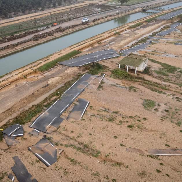 Las imágenes aéreas captadas con dron después del paso de la dana Alice por el Montsià muestran con una claridad aterradora la magnitud de los desperfectos que han dejado las últimas lluvias torrenciales en las Terres de l’Ebre. Tramos enteros de carretera levantados y desplazados, socavones abiertos en medio de los viales, puentes con las estructuras dañadas y montañas de basura acumuladas son ahora parte del paisaje que rodea el curso final del río Ebre. La zona más afectada es el entorno del barranco de la Galera, donde la fuerza desbordante del agua ha desdibujado literalmente la red viaria que conecta Amposta y Tortosa. Uno de los puntos más golpeados es la carretera TV-3443, conocida como la de la Carrova, una vía local paralela al canal de la Dreta de l'Ebre y de titularidad de la Diputació de Tarragona. Varios tramos del asfalto, arrancados de raíz, reposan ahora sobre bancales cultivados del margen derecho del río, después de que la riada, especialmente violenta en el tramo del barranco de la Galera, rompiera el pavimento y lo desplazara decenas de metros como si fuera un rompecabezas desmontado. Los daños son tan graves que la carretera ha quedado completamente inoperativa, a pesar de ser una vía de servicio esencial que da acceso a un matadero industrial de aves y a numerosas fincas agrícolas de hortalizas, cítricos y olivos.