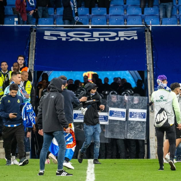 Los jugadores del Barça y el equipo técnico blaugrana, con el entrenador Xavi Hernández al frente, tuvieron que interrumpir la celebración y corrieron en dirección al túnel de vestuarios con el fin de poder esquivar la turba de aficionados radicales. Para evitar la agresión de los jugadores del FC Barcelona, los vigilantes de seguridad privada y también efectivos de la Brigada Móvil (Brimo) de los Mossos desplegaron varias líneas de seguridad. Muchos de los que saltaron se encararon a los vigilantes de seguridad, con el lanzamiento de objetos.
