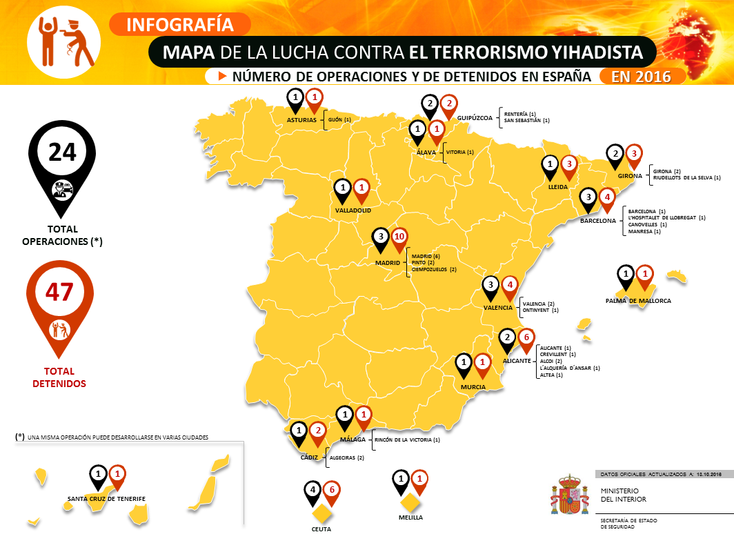 Según la información recopilada por la Secretaría de Estado del Ministerio del Interior, las detenciones por terrorismo yihadista en Catalunya representan en 2016 cerca de una quinta parte de las que se han producido en el conjunto del Estado español.