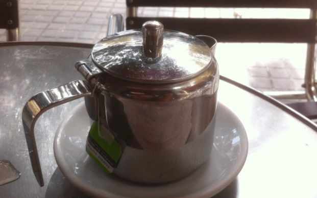 Pido una infusión. Me la sirven en una de estas teteras de acero inoxidable sin pitorro.