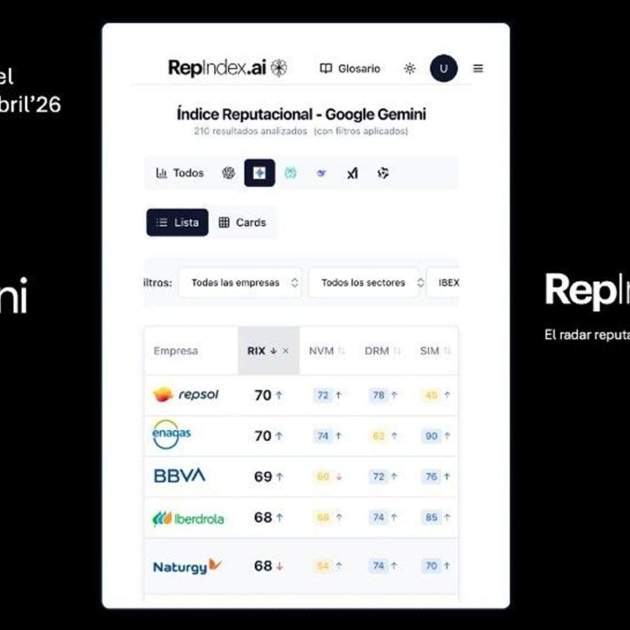 El índice RIX, que mide la reputación algorítmica de la reputación corporativa, sitúa a Enagás y Repsol en cabeza con 70 puntos sobre 100, seguidas de BBVA (69) y de Naturgy e Iberdrola (68), en un entorno caracterizado por la estabilidad reputacional y la consistencia narrativa en inteligencia artificial.