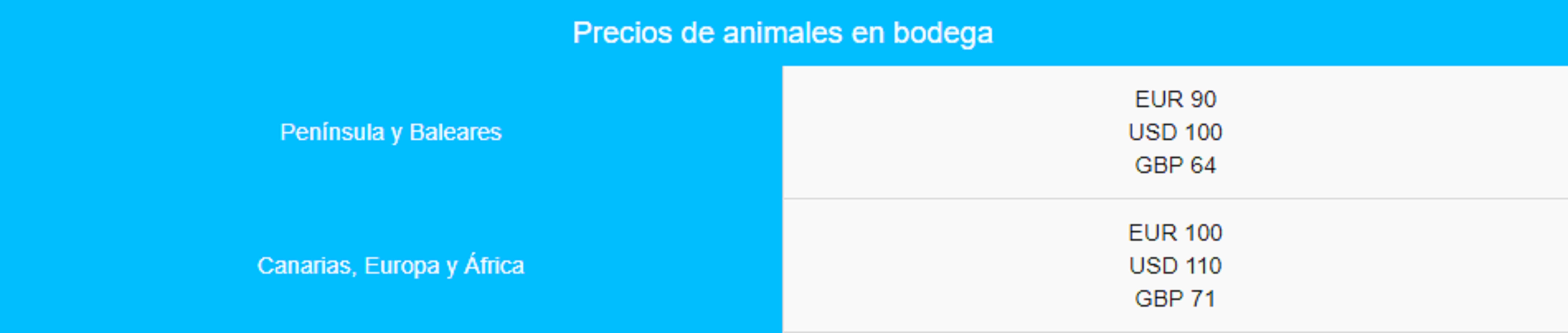 Aquellos animales aceptados para ser transportados en la bodega son: anfibios, insectos, reptiles (excepto tortugas de agua), algunos roedores, hurones y algunos perros. Estos animales se tienen que transportar en un contenedor homologado de puerta metálica, con ventilación y especial para el transporte aéreo.