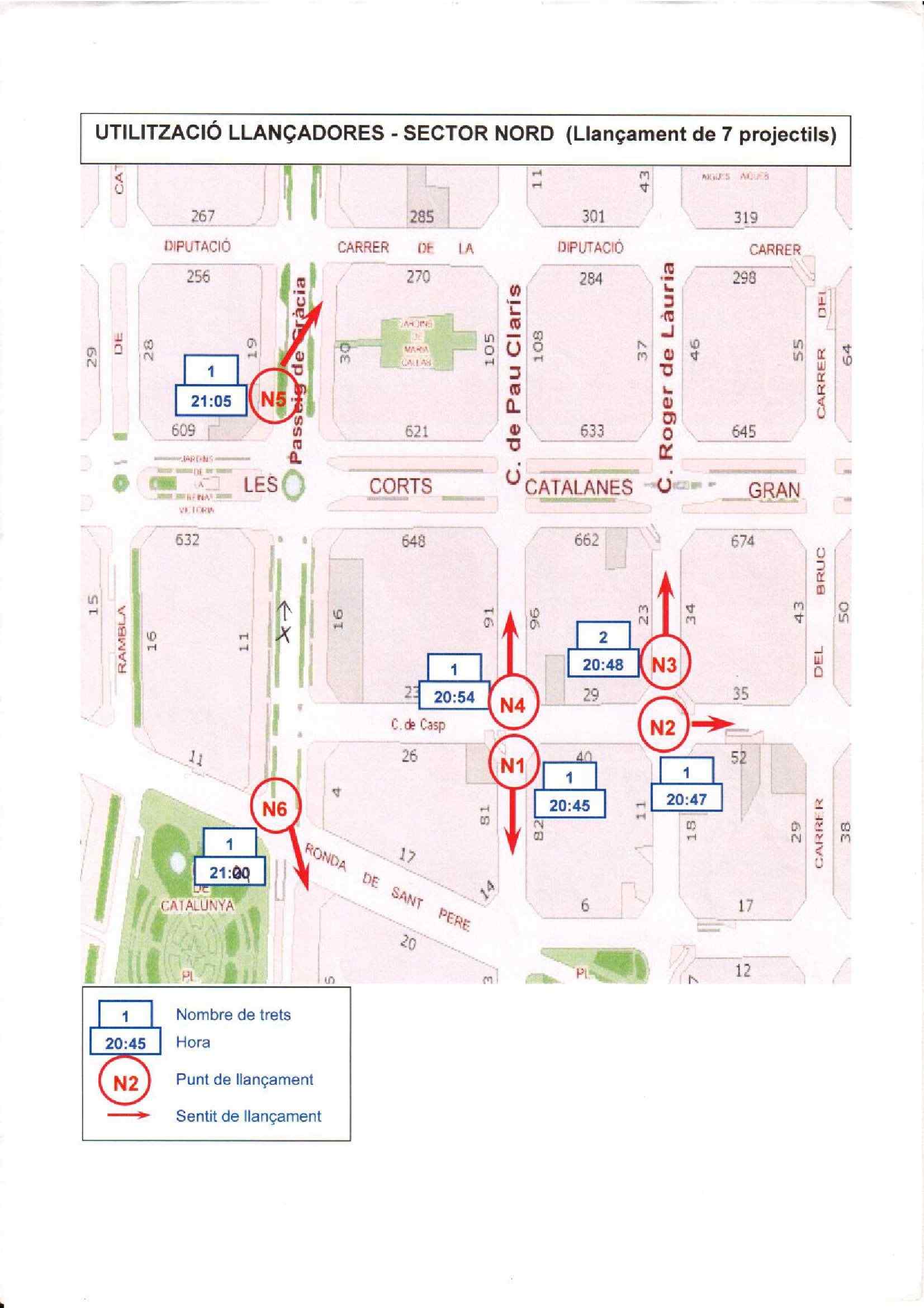 El informe es una hoja con el mapa de la zona, con la posición de las unidades de los antidisturbios, la hora y la dirección en la que se dispararon los 7 proyectiles. En la misma rueda de prensa, se repartió el documento, corregido con bolígrafo momentos antes, porque había un error en la hora del lanzamiento del proyectil de Ronda Sant Pere.