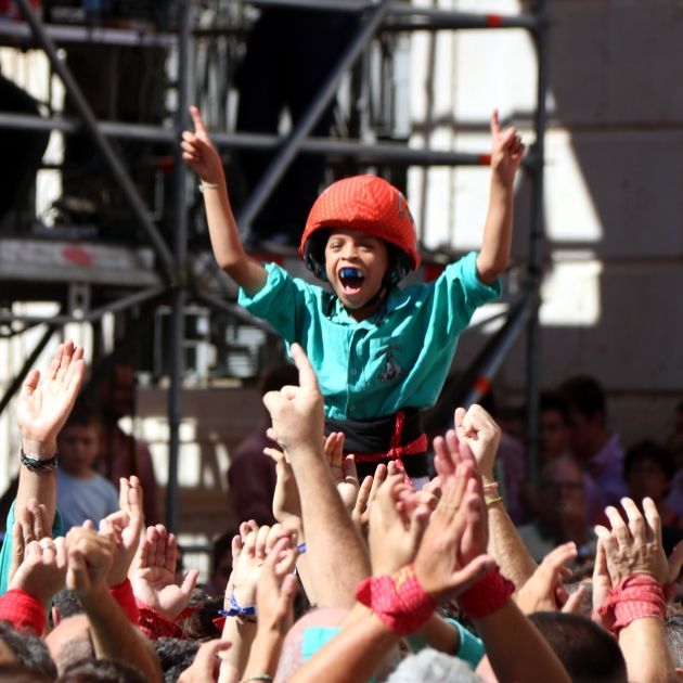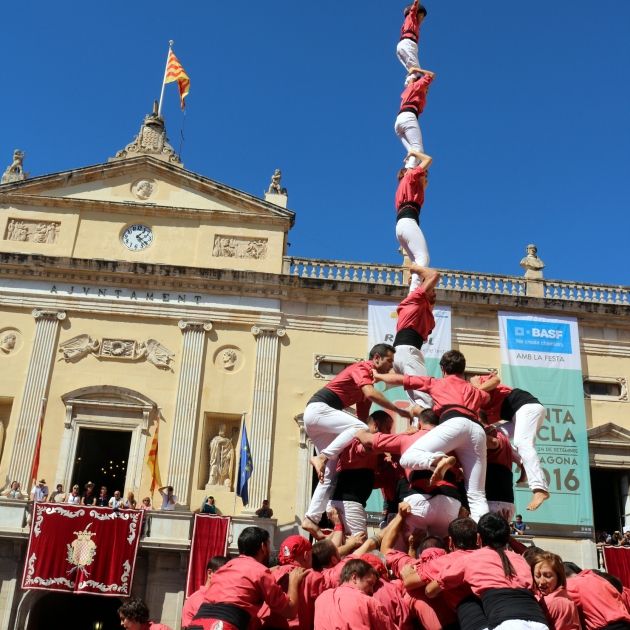 Celebración de los Castellers de Vilafranca en la plaça de la Font de Tarragona después de cargar el 3 de 10 con folre y manilles.