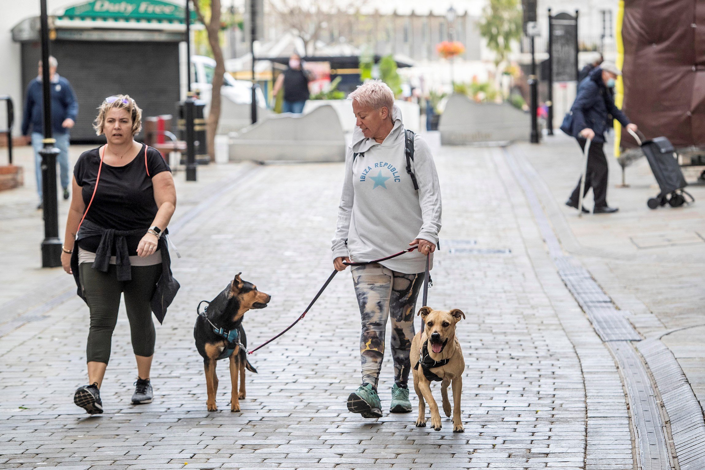 Dos mujeres pasean a sus perros sin mascarilla por las calles de Gibraltar este domingo / EFE